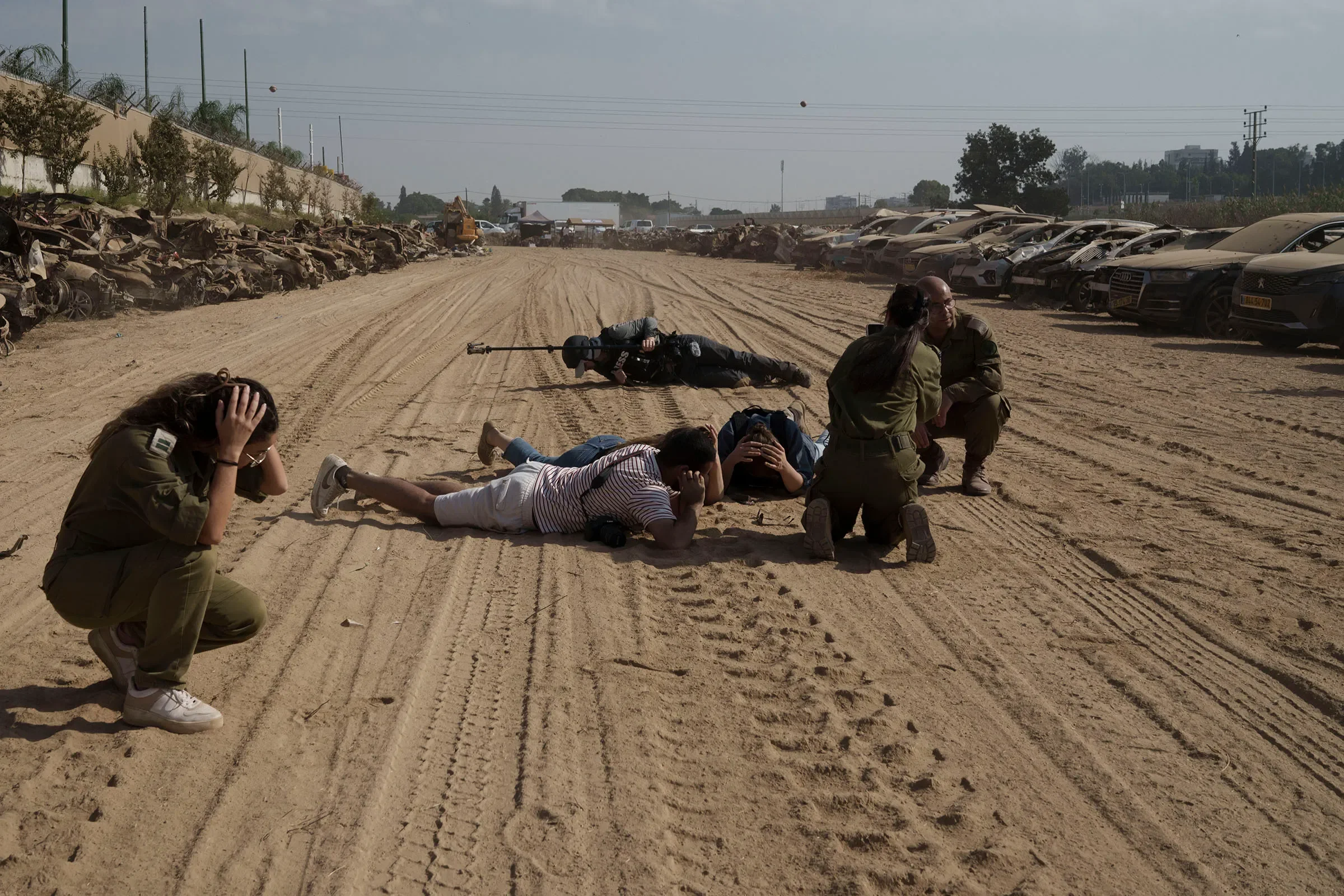 Fuerzas israelíes y periodistas se refugian en el sur de Israel mientras una sirena advierte sobre el lanzamiento de cohetes desde la Franja de Gaza el 5 de noviembre. Las alarmas sonaron en una zona donde se encontraban cientos de vehículos quemados y destruidos tras resultar dañados en el ataque de Hamás contra Israel el 7 de octubre. (AP/Leo Correa)
